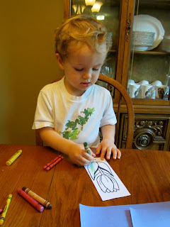 Gather kiddos and have them color flowers (if needed). I helped them choose a correct or at least appropriate color for each one as we rehearsed their names...